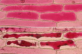 First, the onion skins, which we looked at under microscopes in class; you peeled a fine layer of cells and mounted it on the slide. You drew a picture of one or more of the cells with the purple cytoplasm and the cell wall, maybe a nucleus. Then you added a drop of salt water and observed. It should have looked like this, before and after: